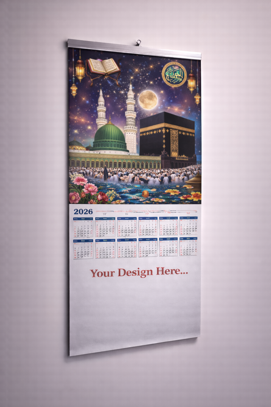 ऊपरी भाग में HD पिक्टोरियल 3D डिज़ाइन है, जिसमें चाँदनी रात, दीपक और धार्मिक प्रतीक कैलेंडर को प्रीमियम लुक देते हैं। नीचे सफेद भाग में “Your Design Here…” लाल रंग में दिया गया है, जहाँ नाम, दुकान/व्यवसाय का नाम, मोबाइल नंबर या विज्ञापन प्रिंट किया जा सकता है।